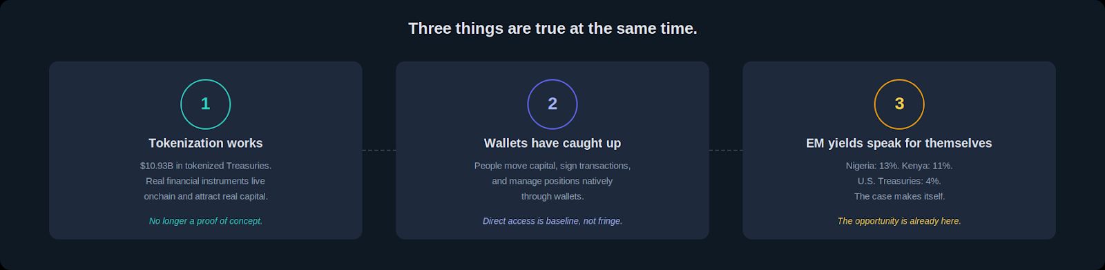 Tokenization has graduated from proof-of-concept to production. Wallet UX has caught up to where direct, programmable access is baseline. And the yield environment in emerging markets makes the case on its own. When a Nigerian government bond pays 13% and a Kenyan 10-year bond pays 11% while a U.S. Treasury pays 4%, the conversation about where capital should be able to flow stops being theoretical.